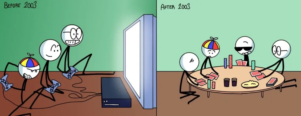 Prior to 2003, the only time I ever played poker was either Chinese poker (pai gow) with my grandma and great aunties during Tet or playing simple five card draw with other kids for snacks and candy. Post-2003 WSOP, the game of Texas Hold’Em became an unexpected cultural phenomenon–every teenage boy either owned a chip set or knew a guy who owned a chip set. All the cool kids would hold their own home poker games8I feel so nostalgic of this time as I write this… this was pre-smart phone, pre-Youtube, and World of Warcraft hadn’t even come out yet. We needed something to entertain ourselves and it was this basic-ass analog card game that Wild Bill Hickok used to play 130 years ago that ended in his murder.. I’d hear about home games from 3 cities over where my sister would have to drive me an hour.