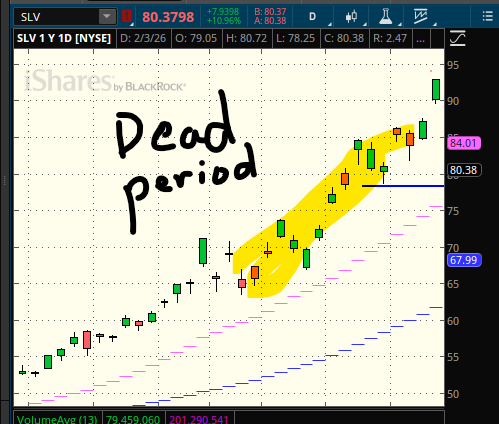 So it’s Friday morning. I wake up and check my phone. Both metals down substantially more. AGQ below 300 and silver futures in the 90’s. GLD in the low 450s. I didn’t want to take a position overnight and I didn’t want to trade futures at shitty graveyard hours. What can you do? Missed the turning point, it’s over for me. Risk-reward says chasing now isn’t a good idea.
