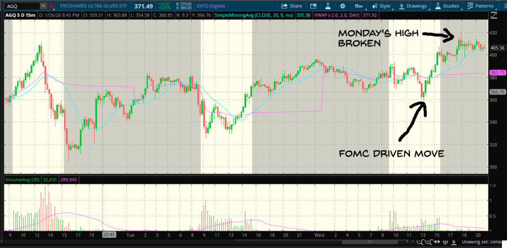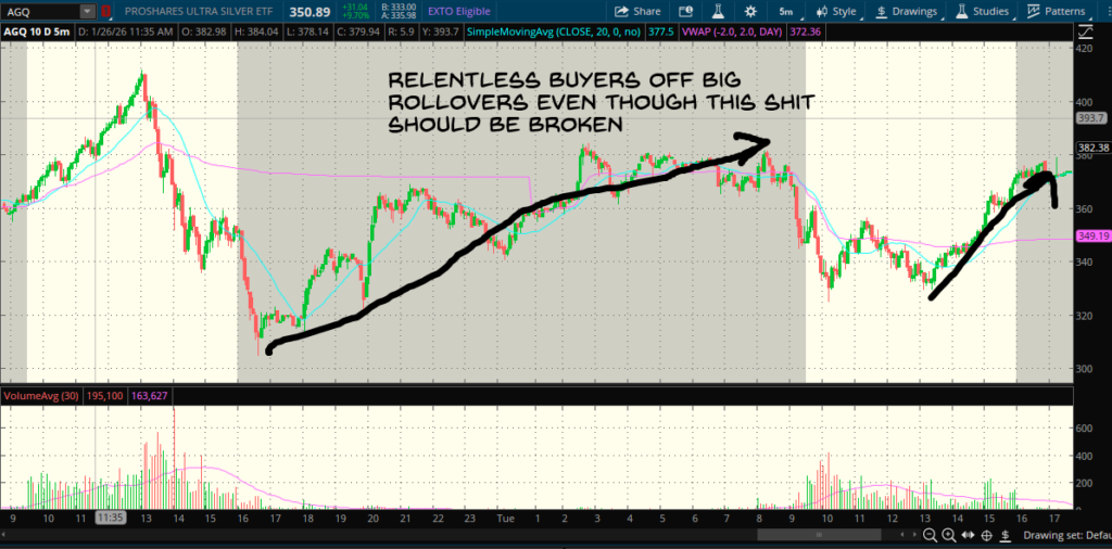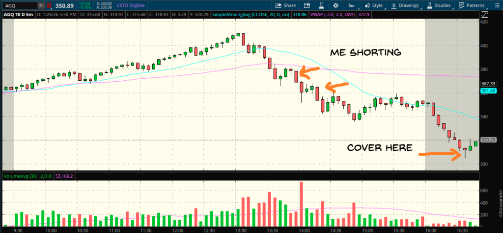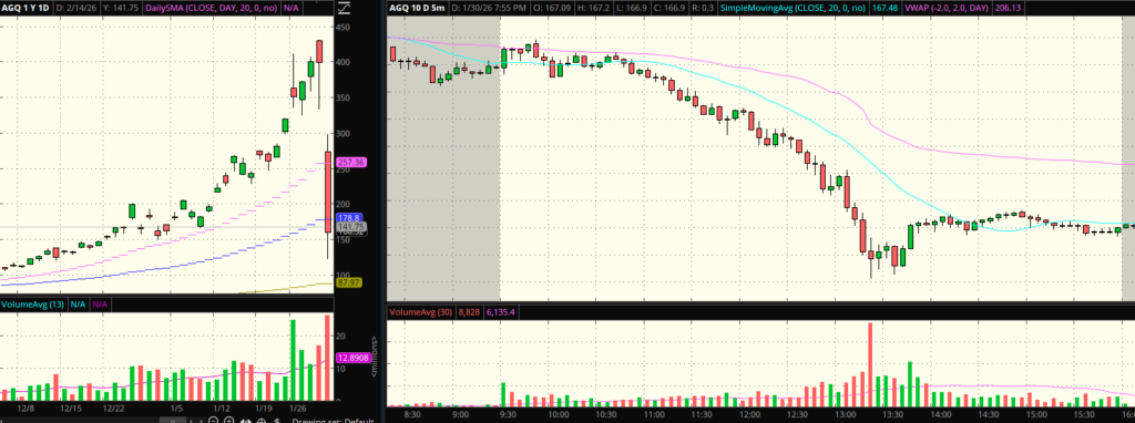 So here’s my first shot at this–silver gaps up over $80 on Sunday but fades to negative territory before Monday’s open. I don’t even have a futures account anymore so I’m stuck trading the ETF proxies like SLV and AGQ. Doesn’t look like one of those A+ mega parabolic setups where I can get into the 0dte puts with 5-10x payoff potential. Might still be OK for a quick trade. I avoid the options but I short AGQ at $180 the next day pre-market. It trades to $157. Very clean and orderly and my execution is solid, thus not triggering my impatience/anxiety issues. Not too shabby. I collect $35,000 on the trade. My first profit in god knows how long.