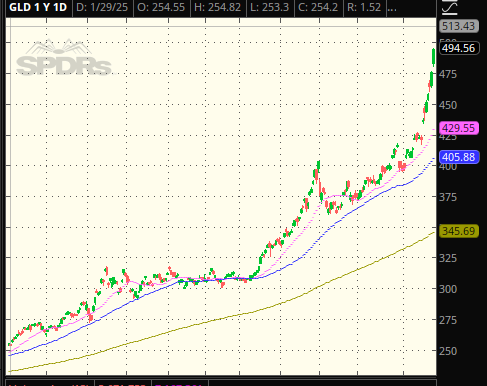 I haven’t talked about gold yet, have I? Even though the SLV price action suggests some imminent top is near, the gold move has likely given silver some last gasp of strength. We’re now in a $5000/oz. gold society.
