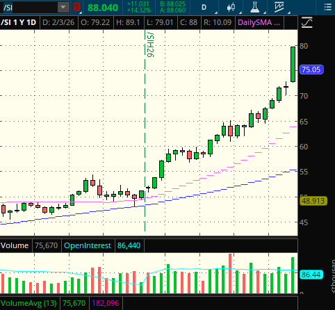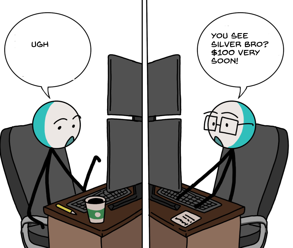The days go by and waste away as silver grinds towards $100. It was always going to get there. Stupid of me to even try to short before that. I hope one day it just plunges 50% and it dies and I don’t care if I have any position, I just want to be over it. I hate that I planted this seed in my mind and can’t get it out.